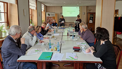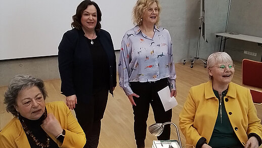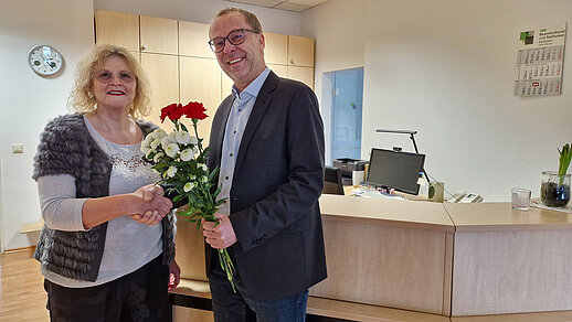 Auch in der SBB Geschäftsstelle gab es Blumen zum Frauentag. Vorsitzende Rita Müller nimmt die Blumen entgegen und auch die Damen in der Geschäftsstelle erfahren eine Würdigung durch die Senioren.